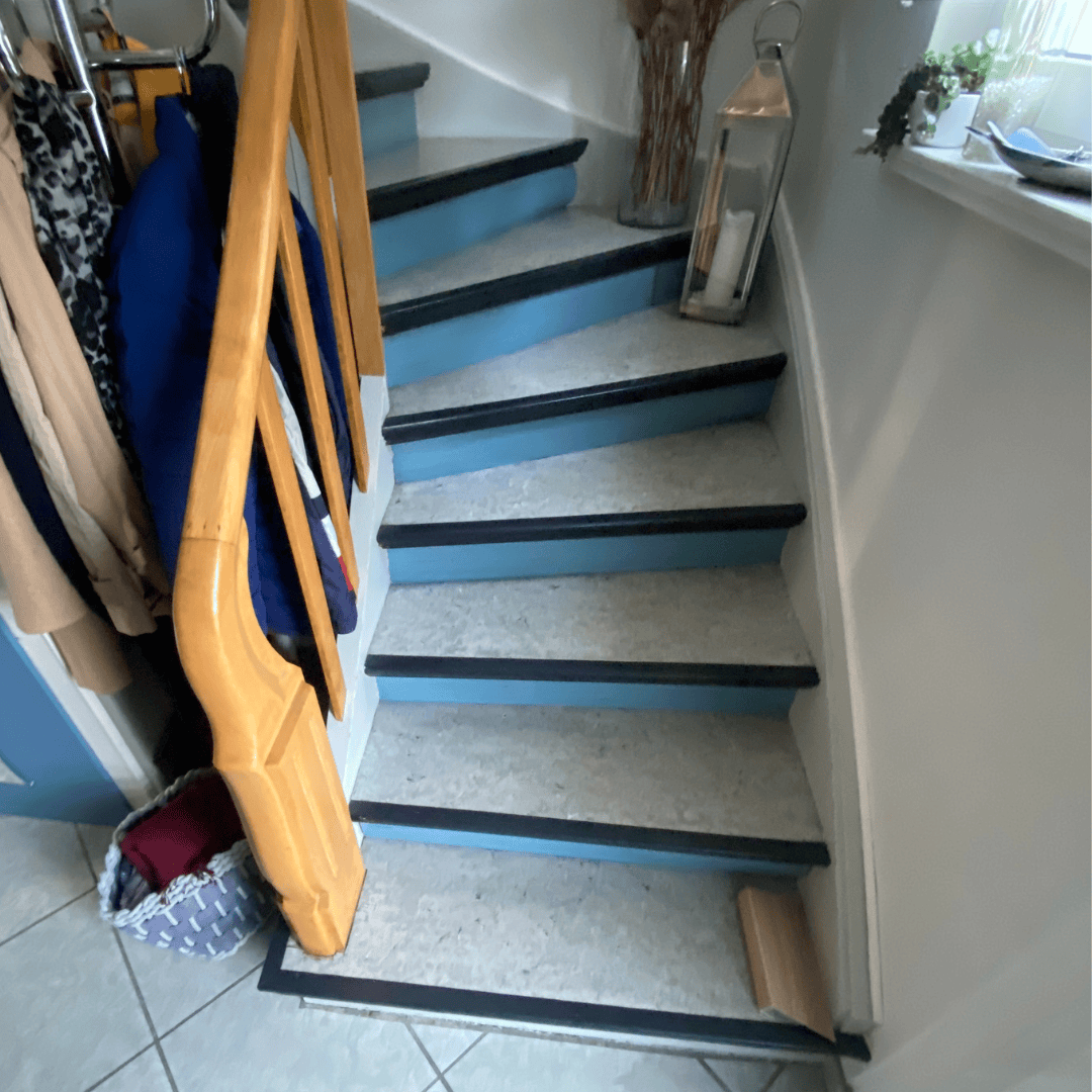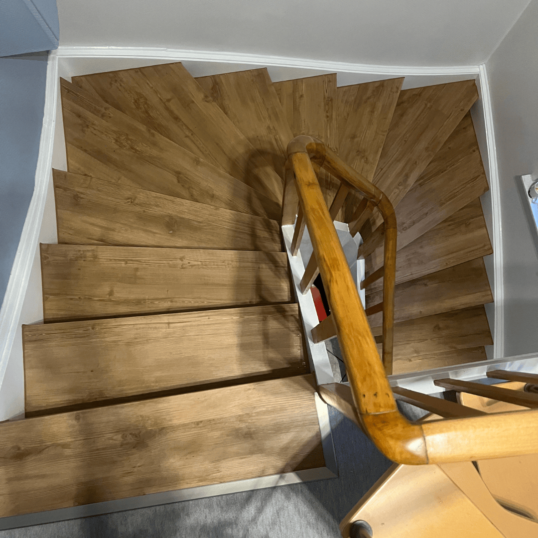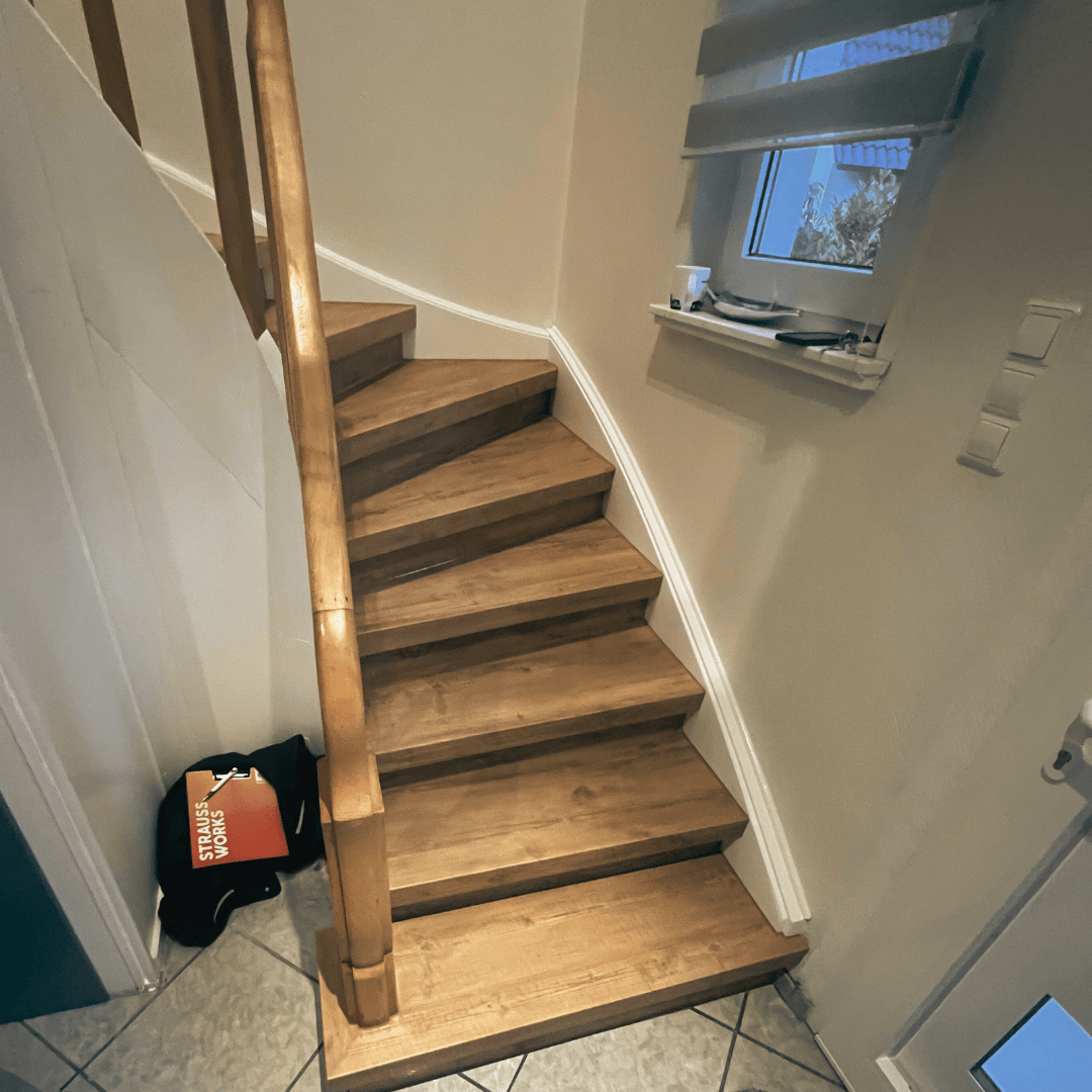 Diese Treppe war mit altem PVC belegt, darunter war eine alte abgenutzte Holztreppe zu finden. Mit unserer Treppenverkleidung aus Vinyl in Echtholzoptik wurden Tritt- und Setzstufe verschalt verkleidet.